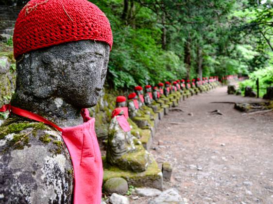 Kanmangafuchi Abyss is a pleasant walking trail through a valley with a babbling river. Known for its red-hatted jizo statues (monk protectors of women, children, and travelers), the trail is said to have a mystery; each time you count the statues, the number changes. Adding to the mysticism is a Sanskrit character carved into stone that is said to have been engraved by the founder of Shingon Buddhism, Kōbō Daishi.