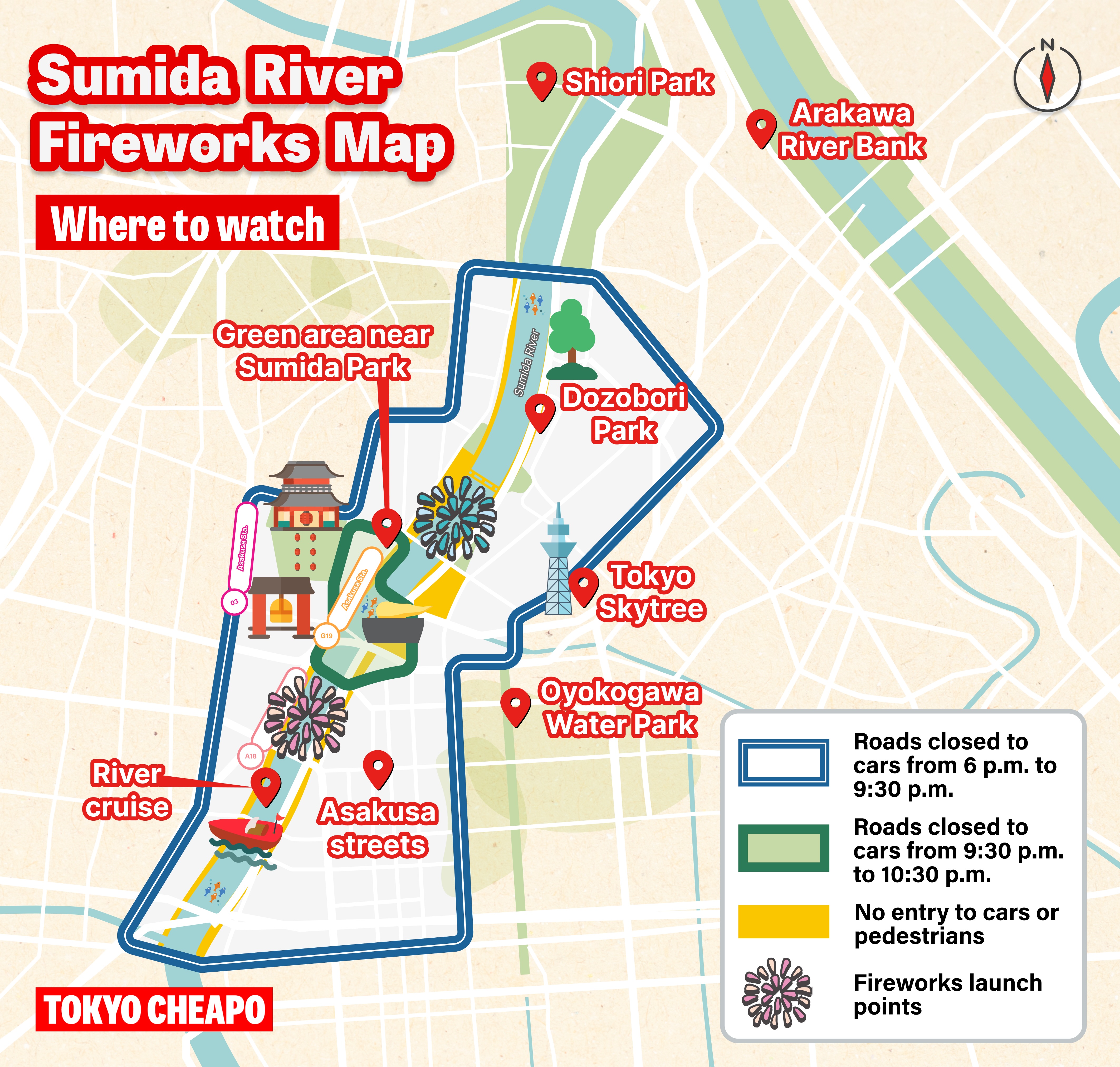 Shiori Park has a slightly obstructed but decent view. The park closes near launch time, but you can squeeze in if you head south slightly towards Asakusa. Aim to get to one of those two spots by early afternoon and chill till the show gets started.