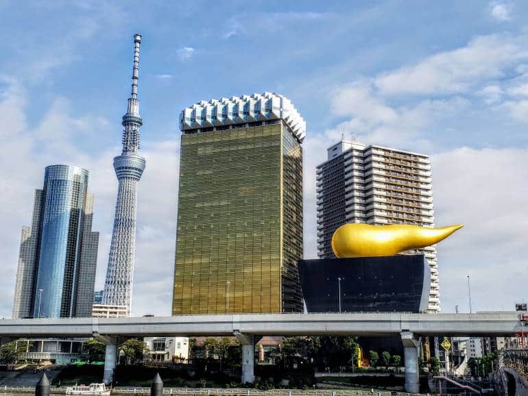 Keep your eyes peeled for the giant Golden Poo sculpture on the roof of the nearby Asahi Breweries headquarters. If you feel like getting a closer look, hop on a river cruise (technically a water bus). You can get to the Hama-rikyū Gardens and Odaiba this way, and a number of other destinations too.