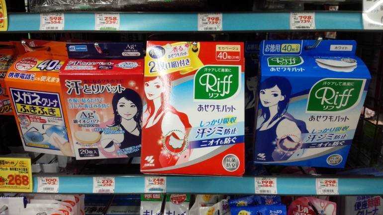 Next is something that I doubt you will be able to find in drugstores in the West. Japanese summers are so hot, and people walk around so much here that they have created sweat blockers pads. And you can get them for only a few hundred yen.