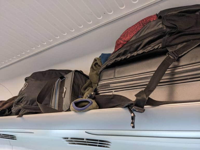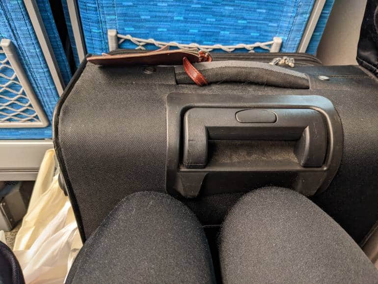 Luggage with a combined length, width and depth up to 160 cm — this is surprisingly big — doesn’t need a seat reservation. It can either be placed in front of you (goodbye, legroom) or in the overhead luggage rack, provided it doesn’t jut out in such a way that it could fall or be bumped. And it’s light enough for you to lift.