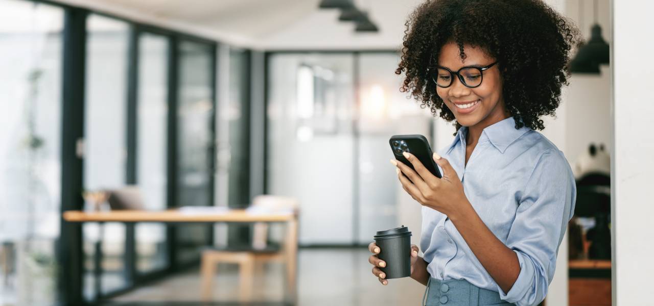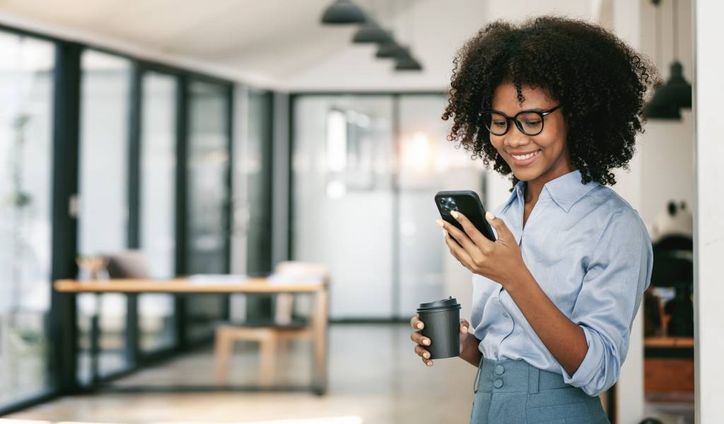 A woman in business attire works at her laptop. A phone with an eSIM installed sits next to her.