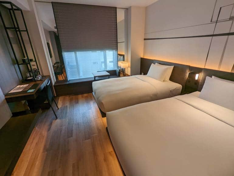 The rooms are spacious and have both natural light and warm mood lighting. The toilet and shower/bath are separate, which is a plus. While the bigger rooms have a bath and desk, the standard size only have a shower and small table for working. Most rooms have a window sill with a cushion instead of a long sofa — I’d have preferred a sofa.
